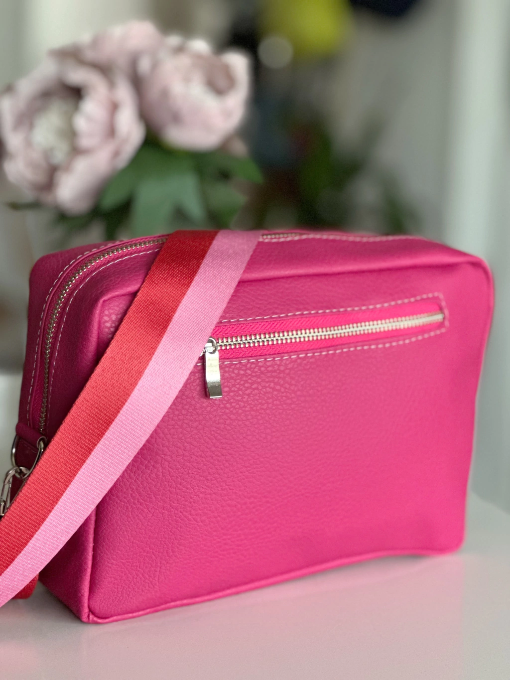 Nueva!!! Bandolera de ecocuero color fucisa de 27 cm de ancho x 17 cm de alto x 7 cm de profundidad. Interior forrado en gros rayado. Bolsillo en la parte interior con cierre y bolsillo trasero con cierre tambén. Correa de 1,30 cm regulable e intecambiable!!