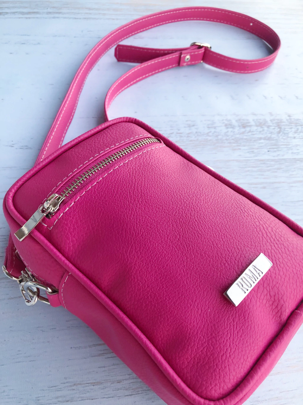 NUEVA!! MINI BAG de ecocuero color fucsia de 20 cm de alto x 13 cm de ancho x 5 cm de profundidad . Interior forrado con gross rayado. Bolsillo con cierre en la parte delantera y bolsillo sin cierre en la parte trasera. Entra todo lo que necesitás llevar: celu, billetera, llaves, alcohol.