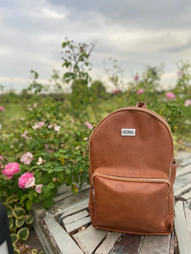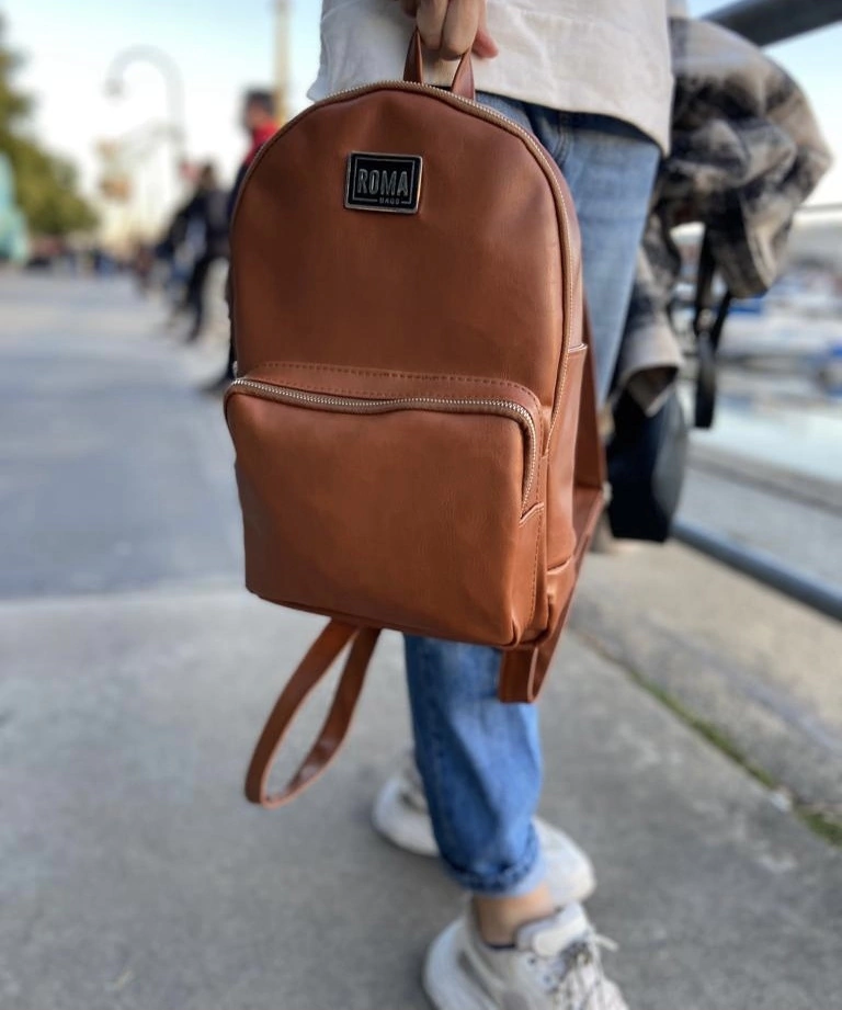 Mochila de ecocuero color suela de 40 cm de alto x 28 cm de ancho , con interior forrado en gros rayado y dos bolsillos internos . Bolsillo grande en la parte delantera y bolsillo con cierre en la parte trasera.